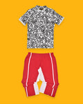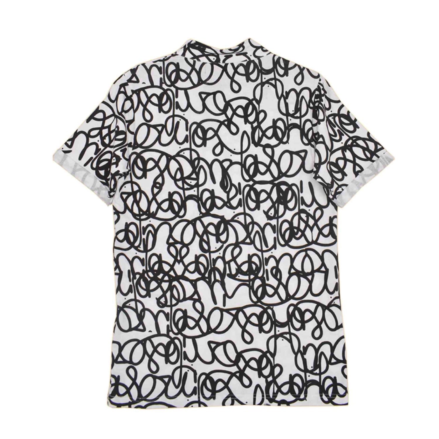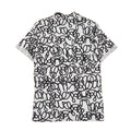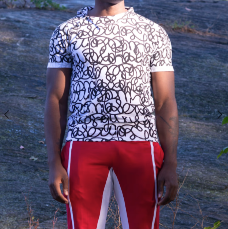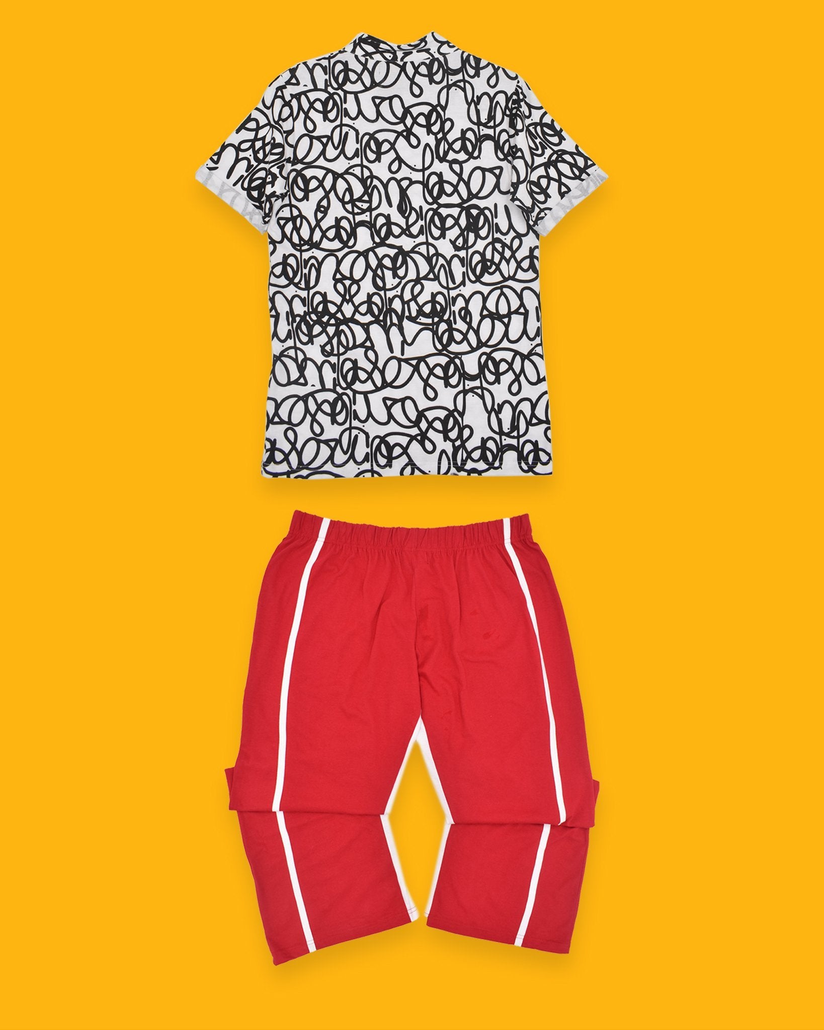 The Graffiti Print Shirt and Pant Set. It is a bold, street-inspired ensemble that brings comfort and edge together. This two-piece set features track suit-style pants paired with a white top, both showcasing a striking black scribble graffiti design. The pants are loose-fitting without being baggy, offering a relaxed yet tailored look, and include pockets for added functionality. The top fits closer to the body, similar to a polo shirt, creating a sharp contrast to the laid-back pants. Unique button detailing runs along the right chest, stopping at the peck level, adding an unexpected twist to the classic silhouette. Perfect for making a statement while staying comfortable.