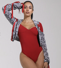 Beautifully crafted, cotton-based piece designed to fit and flatter the wearer's body. Its long sleeves are made from breathable fabric, making it an ideal choice for cooler weather while still offering comfort and ease of movement. A subtle sweetheart-like neckline adds a graceful, feminine touch to the design, complemented by underwire support at the bust for added shape and security. Available in Black, Burgundy, and Tan, this versatile leotard blends elegance with everyday practicality, perfect for layering or wearing alone.