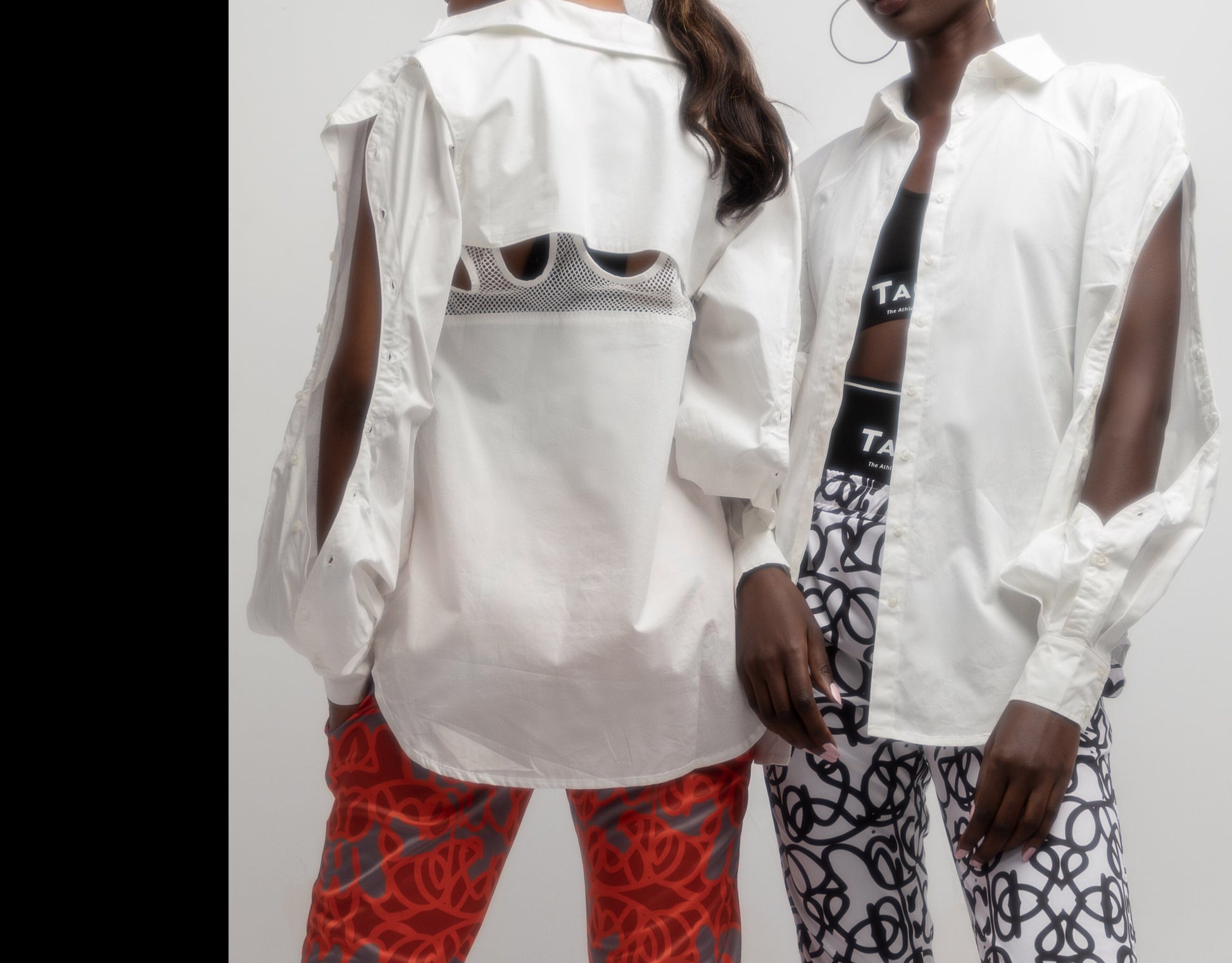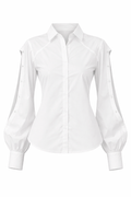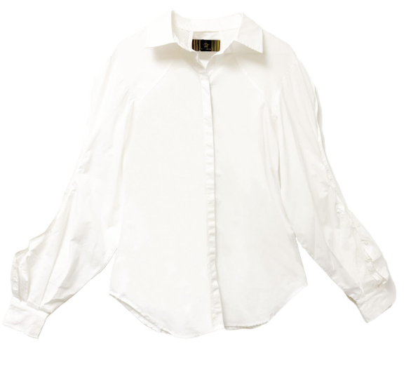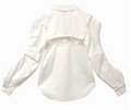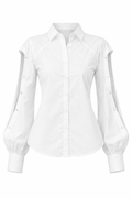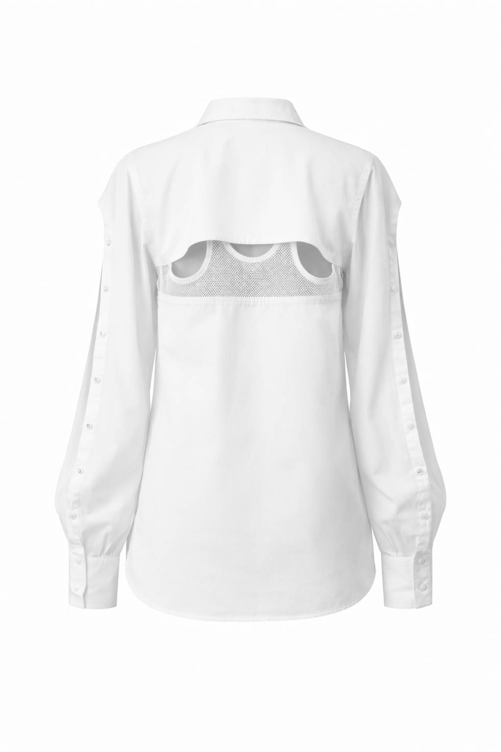 Featuring open long sleeves and a detachable mesh back panel, this shirt allows you to style it multiple ways—keeping it elegant and structured or adding a touch of modern edge. Perfect for pairing with high-waisted trousers, skirts, or layered over a dress for a standout look.
