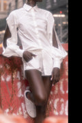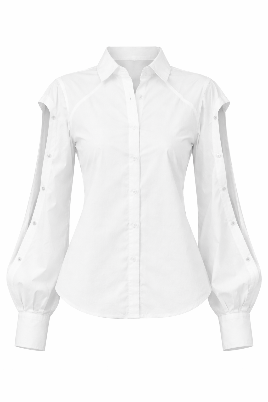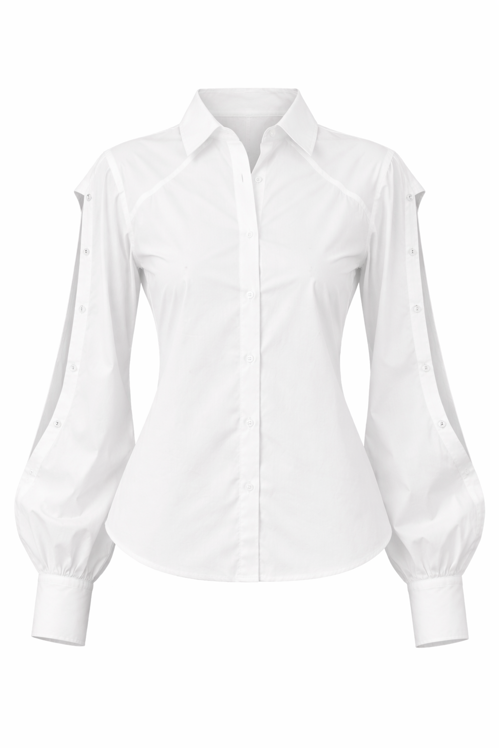 The Anne Detachable Back Shirt redefines classic tailoring with innovative design. Crafted from sustainably sourced organic cotton, this crisp white button-down offers a sophisticated look with a unique twist.