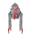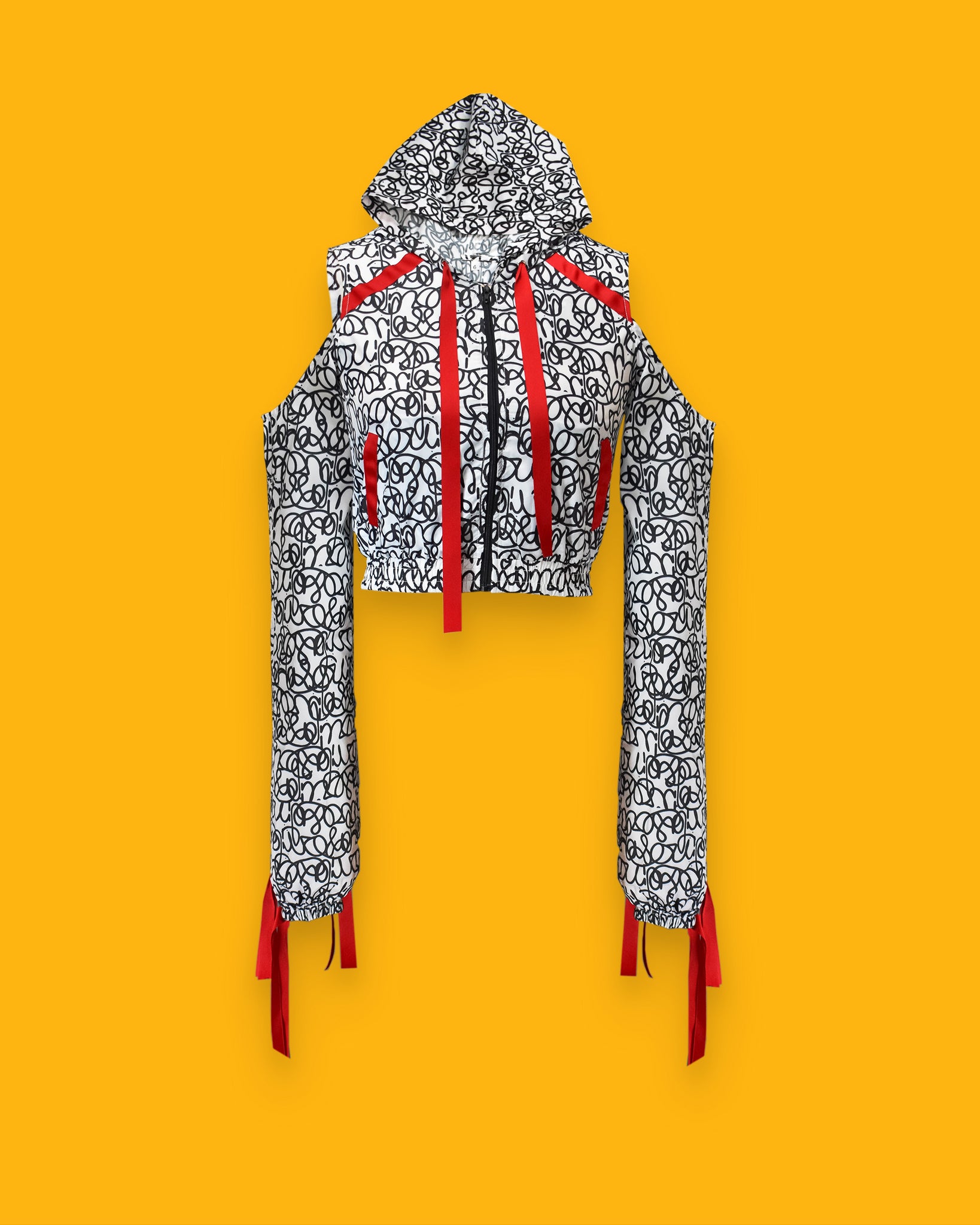 Turn heads in this bold, street-style inspired Lightweight Jacket by TASOU. Crafted from recycled fabric, this eco-conscious piece features a striking black and white graffiti print layered with vivid red accents that make a fierce statement. Designed with an easy front zip closure, exaggerated red drawstrings, and long sleeve ribbon ties, this jacket merges fashion-forward edge with urban practicality.
