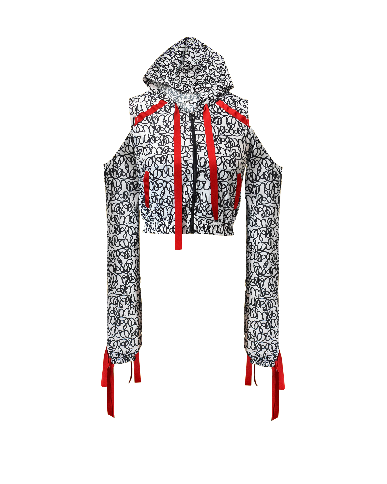 Black And White Graffiti Print Light Weight Jacket With Red Accents.